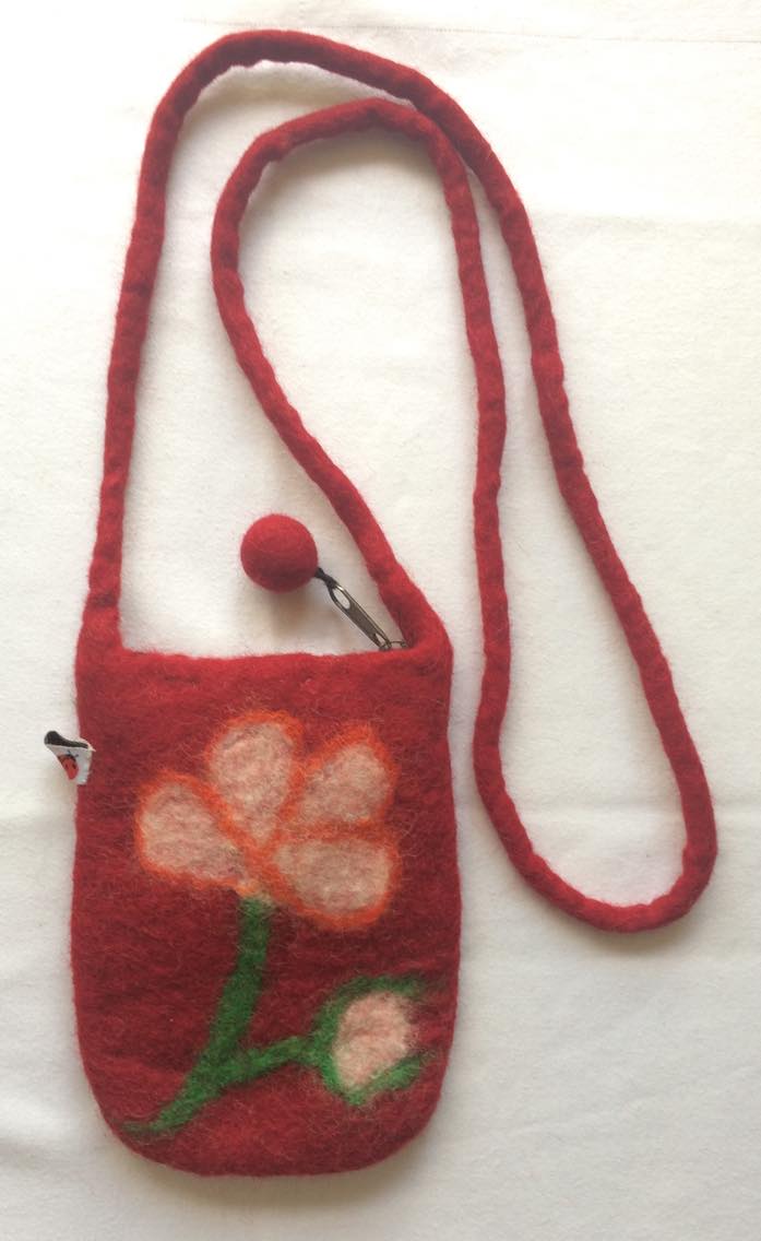 Felt small bag wine/flower Felt small bag wine/flower Zipper with textile lining Size: 15cm x 12 cm Shoulder strap length: 70-80 cm PRICE: 7 €/PCS 1 pcs to basket
